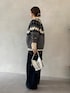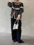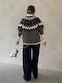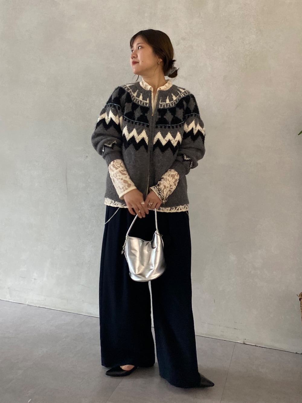 ノルディック柄にパンツ合わせだと カジュアルになりやすいので レースシャツで少し甘さを チェーンサスペンダーで少し綺麗目さを取り入れたコーデに♩ 大人気のタックワイドパンツ。 リアルバイしたネイビーがお気に入りで この冬は1番履いてます! サイズはTMにしました。