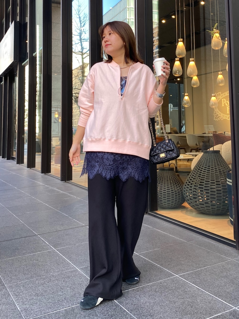 スウェットのピンクとレースのネイビー合わせが甘さもカジュアルさもあってかわいい組み合わせです。 お尻もすっぽり隠せるので 細身のパンツあわせでスタイルアップして見えます◎ ________________________ instaでは新作情報など随時更新しています→@___saku14_ アイテム詳細はこちらから ↓↓↓