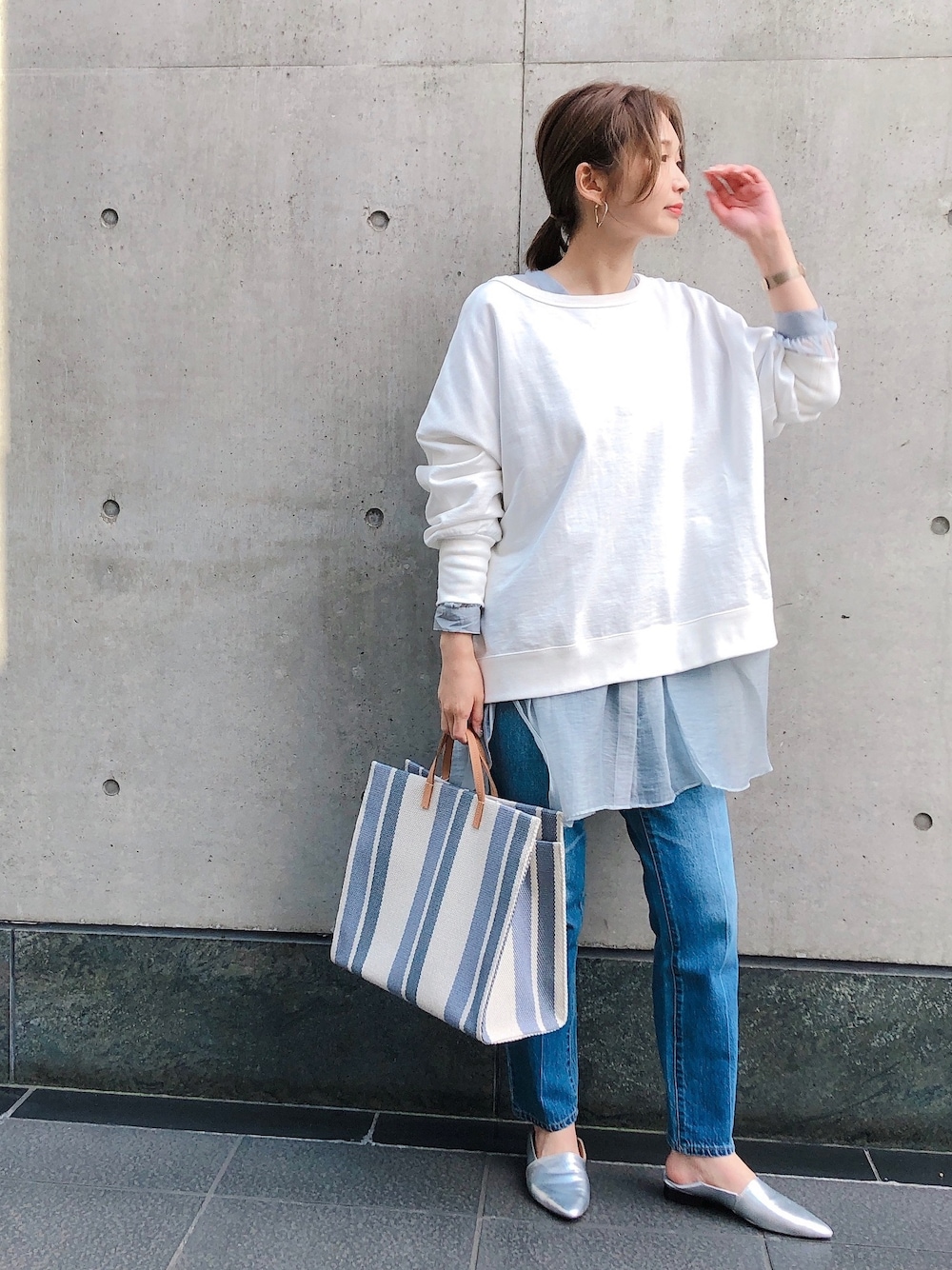 スエットにシアーシャツを重ねたレイヤードコーデ!