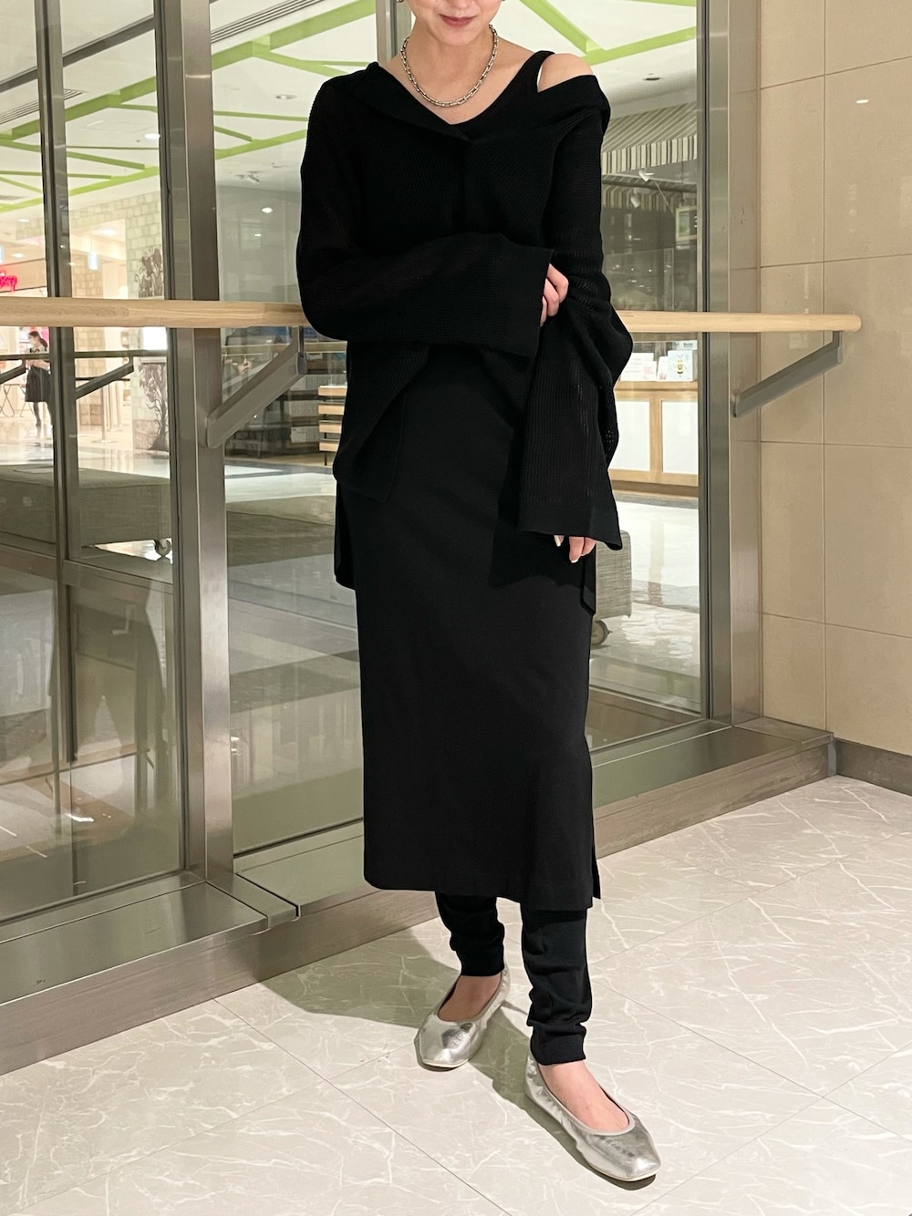 オールブラックで、こなれ感のあるスタイリングです。ニットとカットソーの異素材合わせなので、黒でも重たくならないです。 ご覧頂きありがとうございます😊