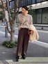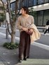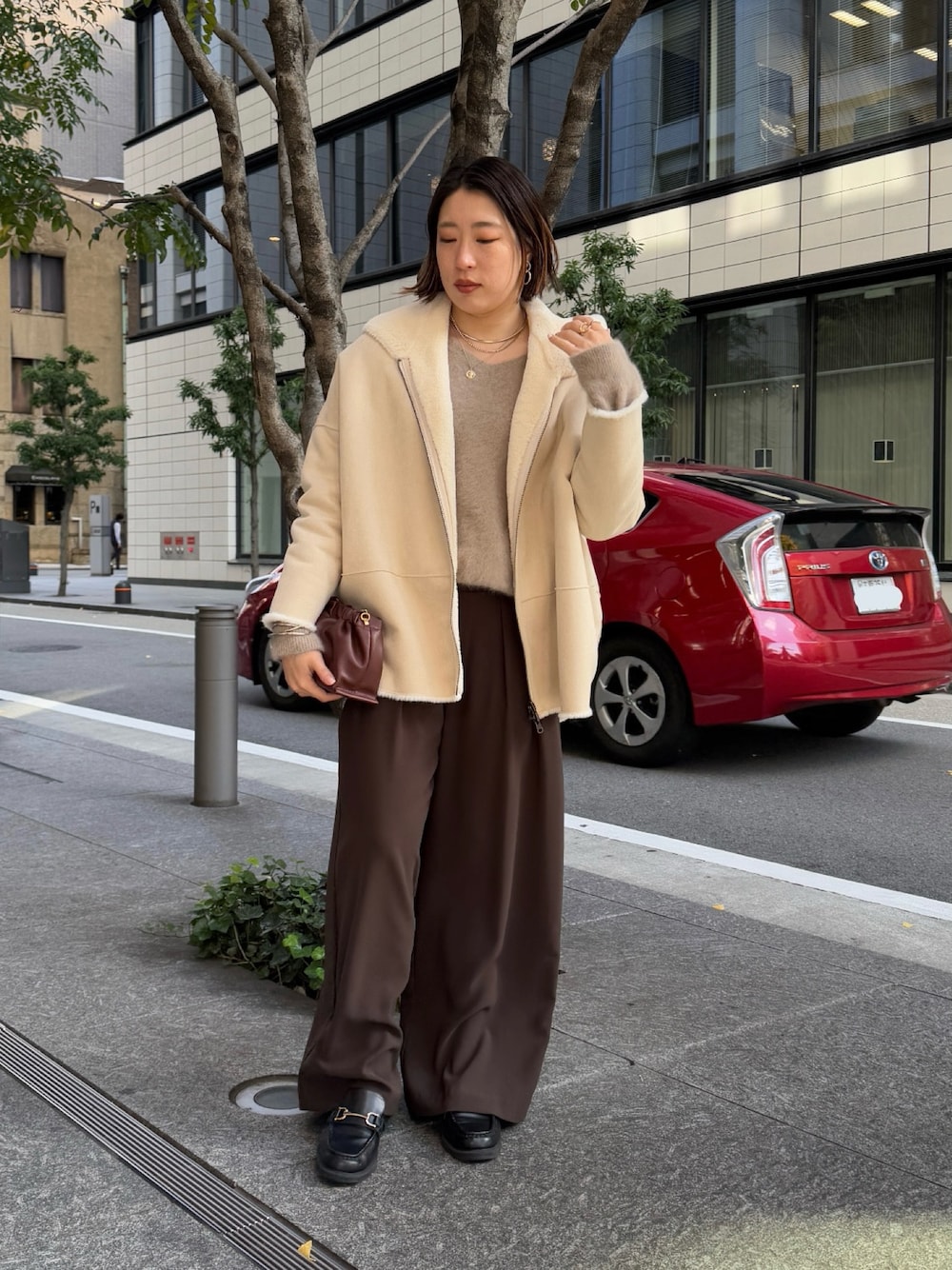 寒くなり最近人気の ファーカシミヤプルオーバーとタックワイドパンツを合わせたコーディネート! ファーカシミヤは上品な素材なので取り入れるだけでスタイリングも上品な女性の雰囲気をプラスしてくれます! アウターのファーが素材ダブりするのでスウェードを表にして着ています! vネックなので アクセサリーをじゃらっとつけて 首元を華やかになるように意識しています! 【アウター】Color:アイボリー Size :Free 【トップス】Color: モカ Size : Free 【ボトムス】Color: ブラウン Size:TM