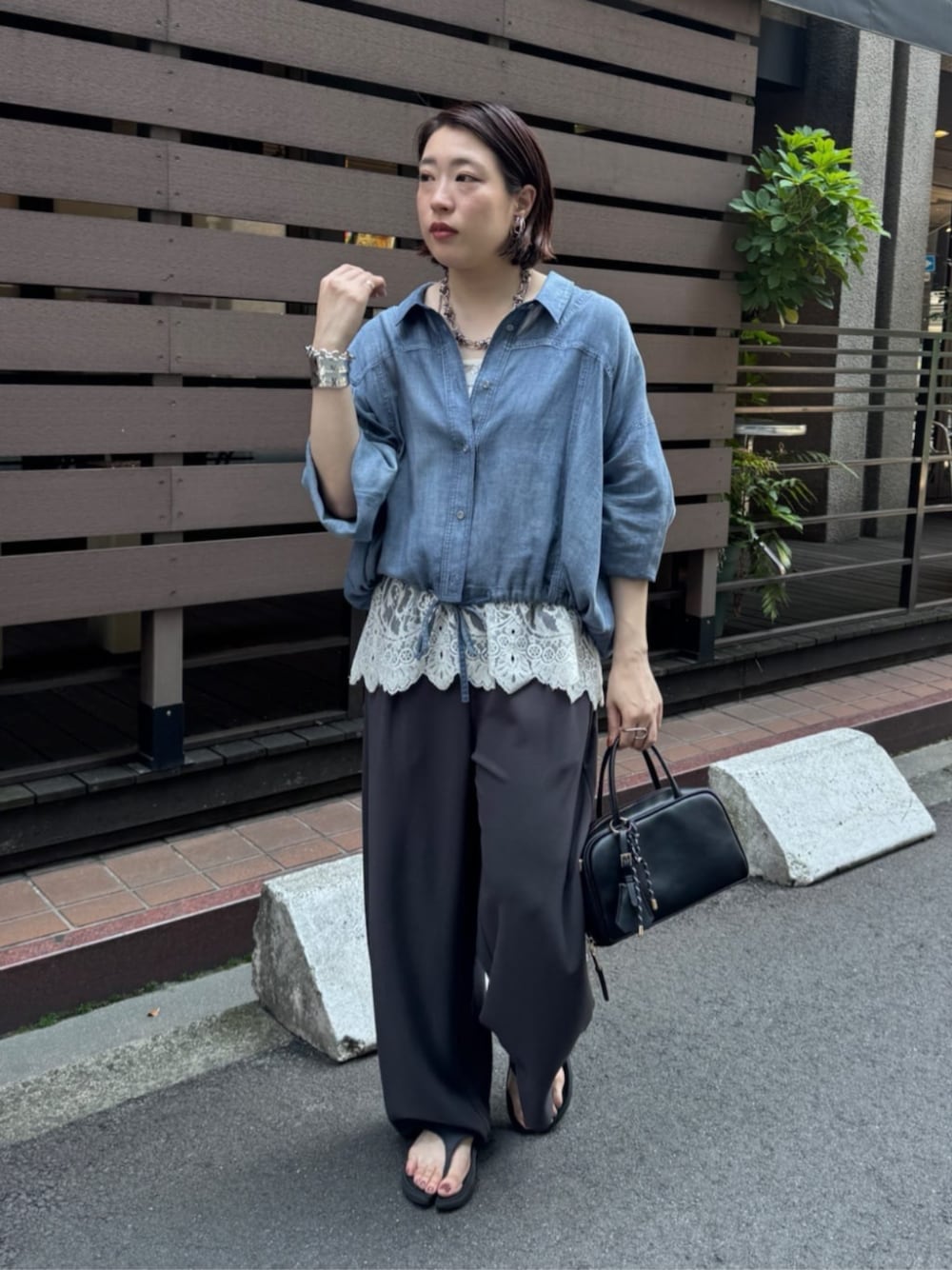 人気の袖リブシアーデニムに New verが登場! 短めの丈に 裾にドロストが付いているので シルエット変化する事ができます!! ドロストを絞って丸みのあるシルエットに するのがおすすめです! 丸みのあるシルエットなので 裾からインナーのキャミが出てメリハリを つけました。 シアー素材なので、夏から秋にかけて 着用できるのも嬉しいですよね! パンツはComing soon!