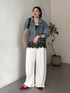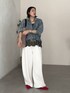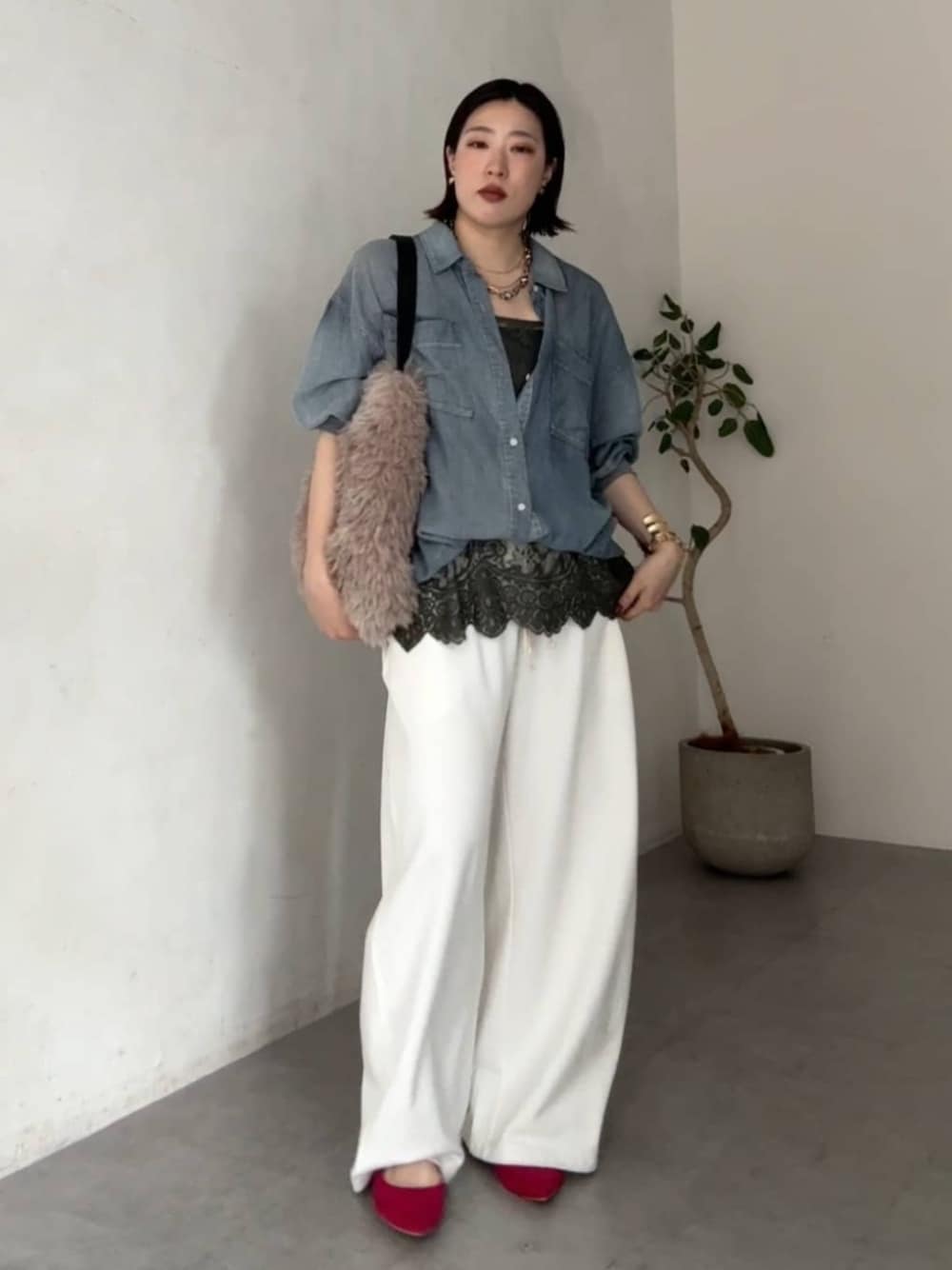 スカラレースキャミの新色の カーキを取り入れたコーディネート! 秋にも着用できる袖リブシアーデニムシャツの インナーとしてレースキャミを入れて、 秋らしいファーバッグを持ちました! ワンポイントにピンクのパンプスを履いて ポイントをつけています!