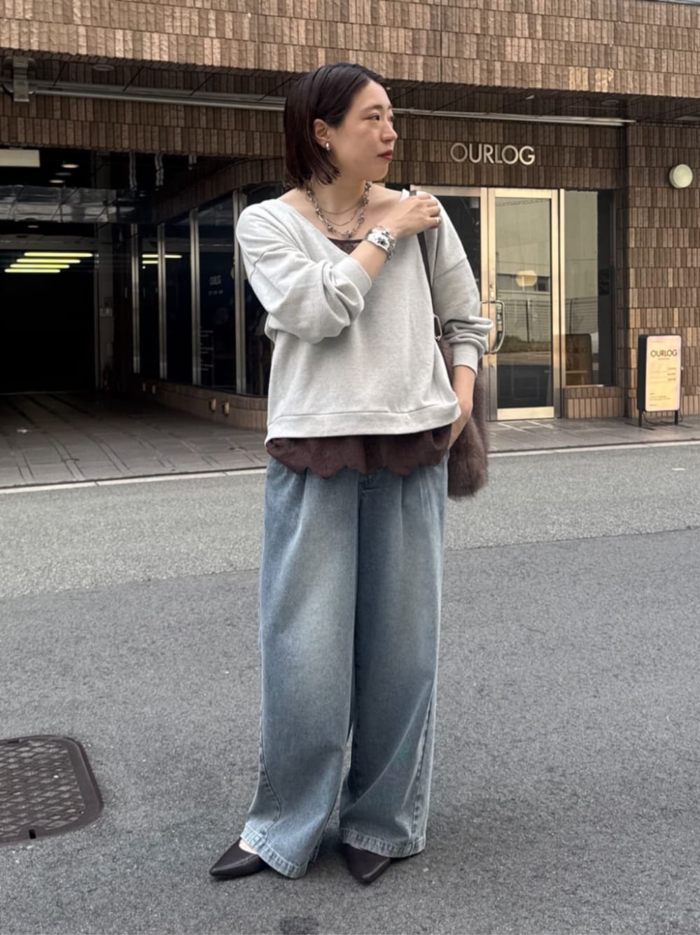 yu(DouDou)のデニムパンツ「デニムワイドイージーパンツ」を使ったコーディネート