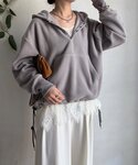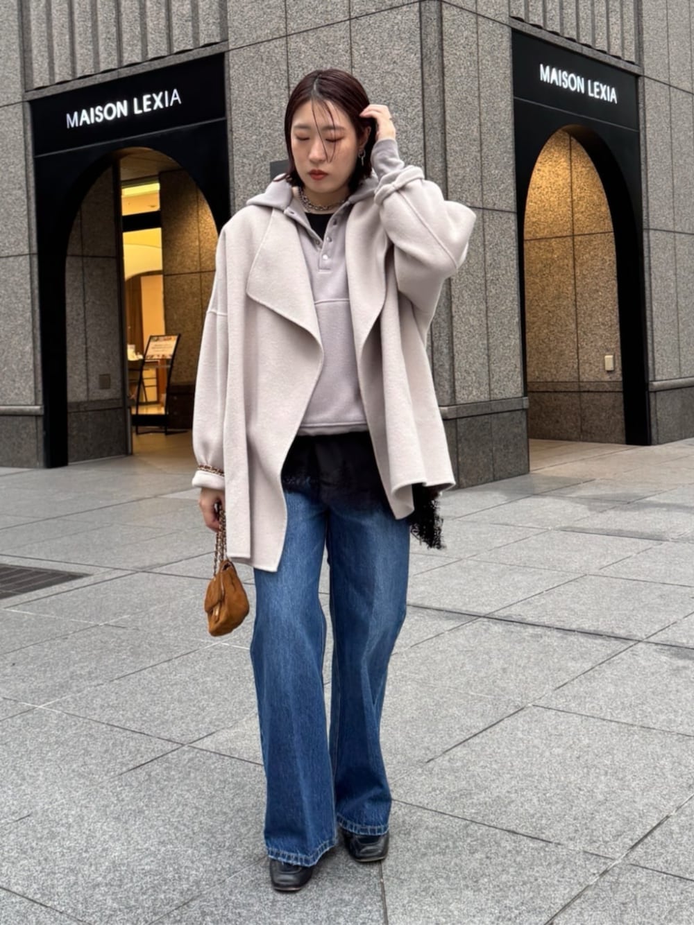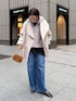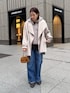 裏起毛が暖かいフードフリースと デニムで合わせて、 カジュアルスタイルになりますが、 レースのブラウスを合わせて 綺麗めの要素をプラスしました! どんなスタイルにも合うコートを合わせたコーディネート!