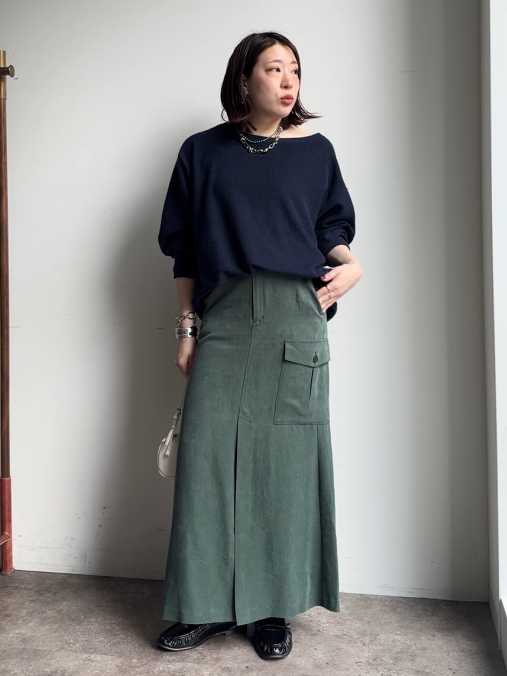 2wayのリバーシブルスウェットに人気のツイルカーゴスカートを合わせたコーディネート! 普段はあまりスカートを着用しませんがカーゴデザインなので カジュアルな雰囲気も残してくれていて カジュアル派の私でも着用できたスカートです!!