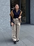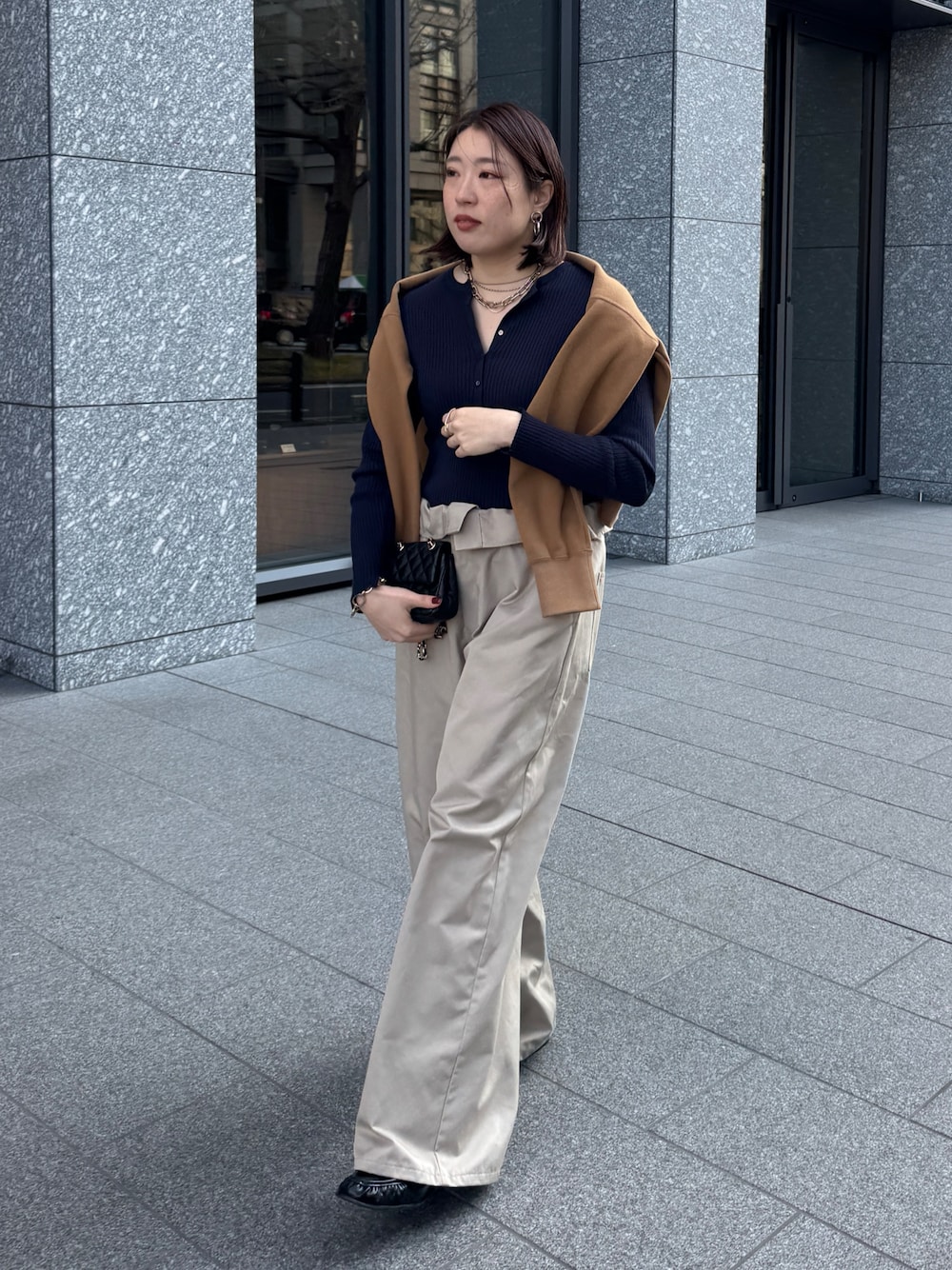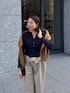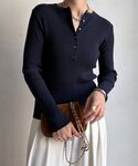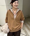 ウエスト折り返しパンツに ヘンリーネックリブニットを合わせたコーディネート! スウェットを肩がけしてアクセントをつけました! ウエストに特徴があるパンツなので、ピタッとしたトップスを着用する事がバランスよくなるポイントです!