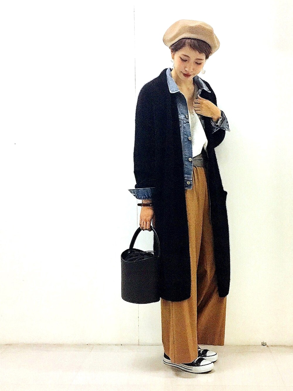 ブラックのロングカーデにGジャン カーディガンはフェレットの毛を使用しているので暖かすぎる💕 最近バケツバッグも気になります、、、 いつもいいね、save、フォローありがとうございます!大変嬉しいです😘
