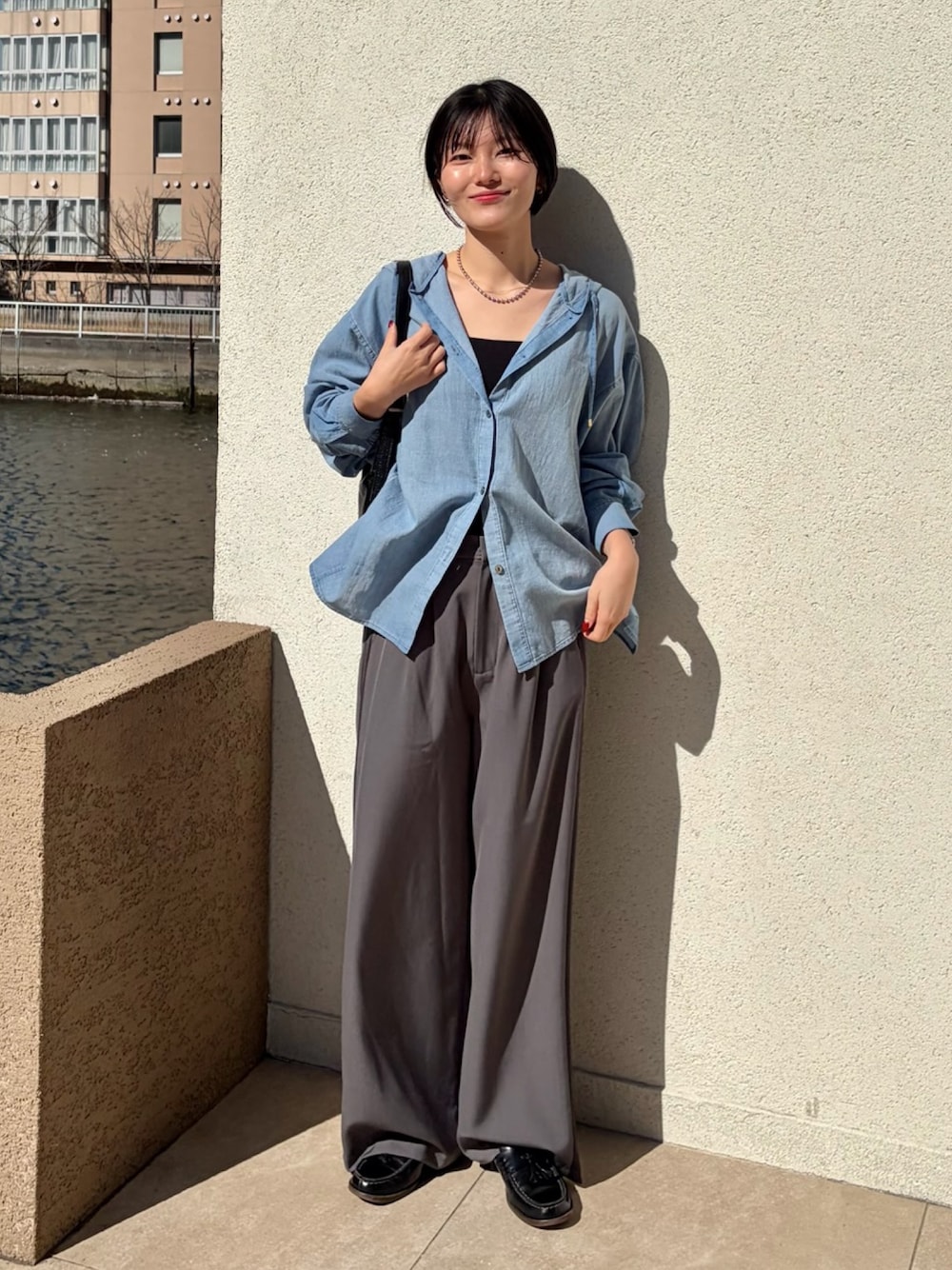 ◎基本情報 身長 157cm 骨格 ストレート 体型 普通 パーソナルカラー ブルベ夏冬 サイズ S or M シューズ 23.0~24.0 【トップス】 color : sax size : F < サイズ感 > 157cmで腰回り隠れる丈感。 身幅は広くかなりゆったりとした お作りです。 フード付きで首元ボタンで開けると 顔周りスッキリ着用していただけます。 < 生地感 > ほのかに透け感のあるシアー素材。 デニムですが軽やかな印象で 着用していただけます。 薄手で落ち感のある生地なので 着痩せ効果◎ < 着用感 > かなり軽い居心地で フードで肩が凝る方にもおすすめ◎ 春夏の羽織でシャツやカーデのバリエーションを作ってくれるフードシャツは洒落感を一気にUPしてくれます! 【パンツ】 color : charcoal gray size : F <サイズ感> ウエストは後ろがゴムになっていて 普段Sサイズの私で 若干ゆとりを感じるくらいのサイズ感。 丈は157cmの私で踵より長く フラットシューズだと床につくくらいでした。 太すぎないワイドストレートなシルエットです。 <生地感> てるっとした落ち感のある生地。 しわにもなりづらく、スラックスのような見た目に反して楽ちんに履けます。 <着用感> サイドラインがトレンドのスポーティ要素を演出してくれるパンツ。 生地感、シルエットは綺麗めなのでカジュアルになりすぎず使えます。 < 着こなし > フード付きのデニムシャツにスラックスを合わせた綺麗めカジュアルコーデ。 フードとパンツのサイドラインが スポーティmixな春コーデに! =============================== ●Instagram → @do_mareiley 是非フォローよろしくお願いいたします!
