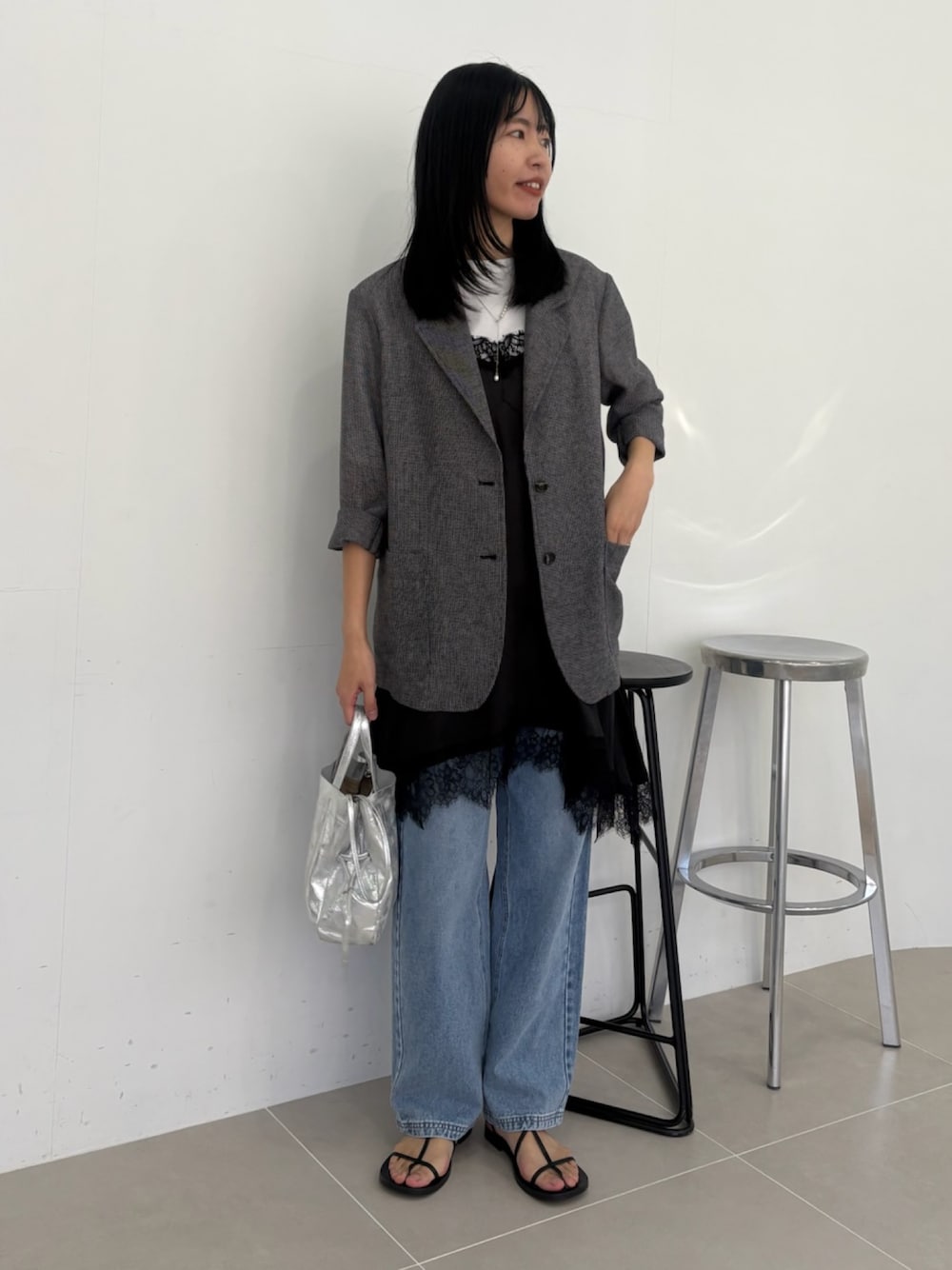 【骨格ナチュラル/イエベ春/173cm】 【ジャケット】Free size サイズ感:全体的に丁度良いです。 身長173cmで手首が出るので2回ロールアップして着用しています。 丈感はヒップがほとんど隠れる丈感です! 素材感:さらっと羽織れるポリエステル100% 人気のメッシュジャケットよりは、少しパリッとしていますが硬くはないです。 着用カラーはブラック表記ですが、濃いグレーに近い色合いです。 【キャミソール】 Free size サイズ感:ウエスト周りも含めて全体的にゆとりがあります。 身長173cmで、肩紐を半分伸ばして着用しています。 背中にゴムがあるので、中にゆったりめのカットソーを着用していますがごわごわせずに着られました◎ 素材感:とろみのある生地で、着ていないくらい軽いです! 胸元と裾にレースが施されているので、上にトップスを重ねたりメインで着たりアレンジが出来そうです◎ 【デニム】着用Msize サイズ感:丁度良いゆとりがあります。 身長173cmでかかと隠れる丈感です◎ 素材感:柔らかいデニム生地です。 Instagram @do_ruko_