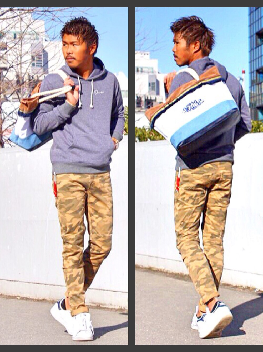 #サイドビーズプルパーカー #スリムストレートカモフラパンツ #切り替えサーフトートバック