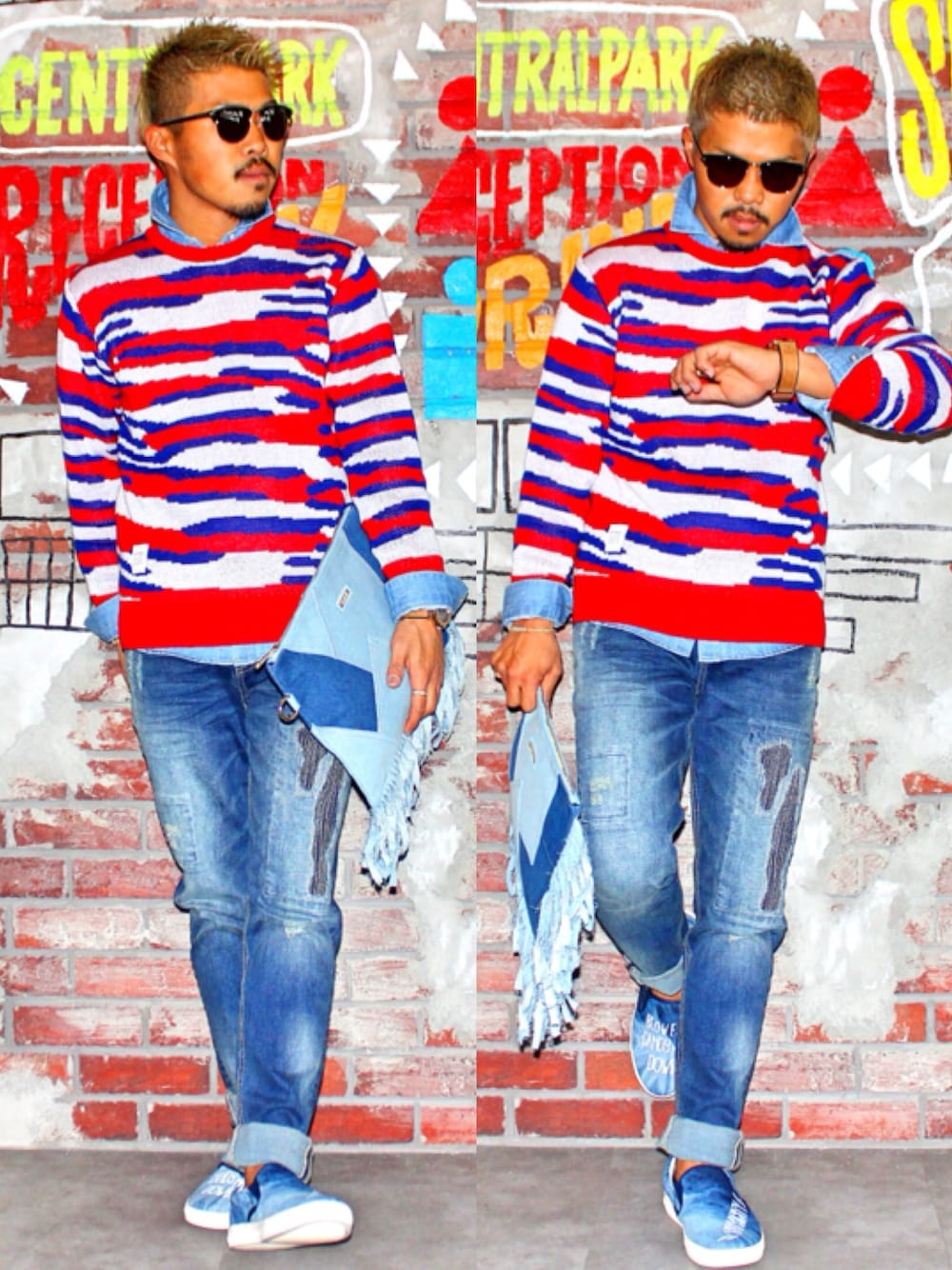 ネイティブロゴ刺繍デニムシャツ カラーカモクルーネックセーター リメイクスリムストレートデニム ブリーチデニムスリッポン デニムパッチワーククラッチバッグ