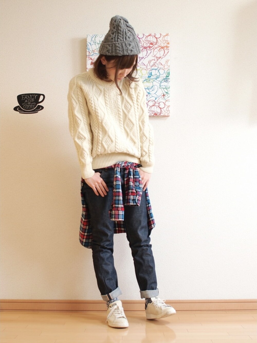 シャツ:UNIQLO 白ニット着まわしコーデです☆ リジットデニムがまだ硬いけど、だいぶ馴染んできた気がします。 白ニットはしっかり編まれているのでずっしり重みがあるけれど、とても暖かいです。 この日のコーデはなんだか動きにくい 笑