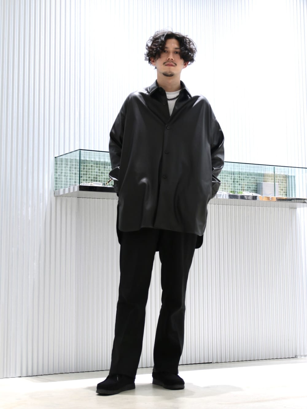 downey(W------room)のシャツ/ブラウス「ウォッシャブルフェイクラムスキン スリットビッグシャツ」を使ったコーディネート