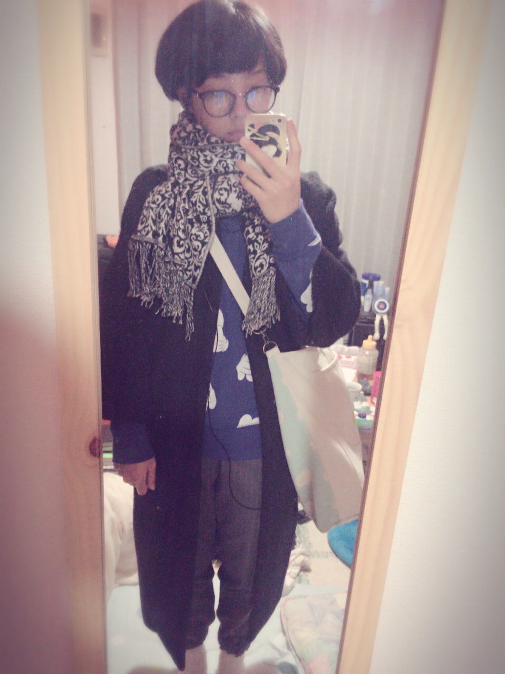 こんばんは。マフラーの結び目を前にするのが楽しいです。 昨日千円くらいで買ったメンズジョガーです。