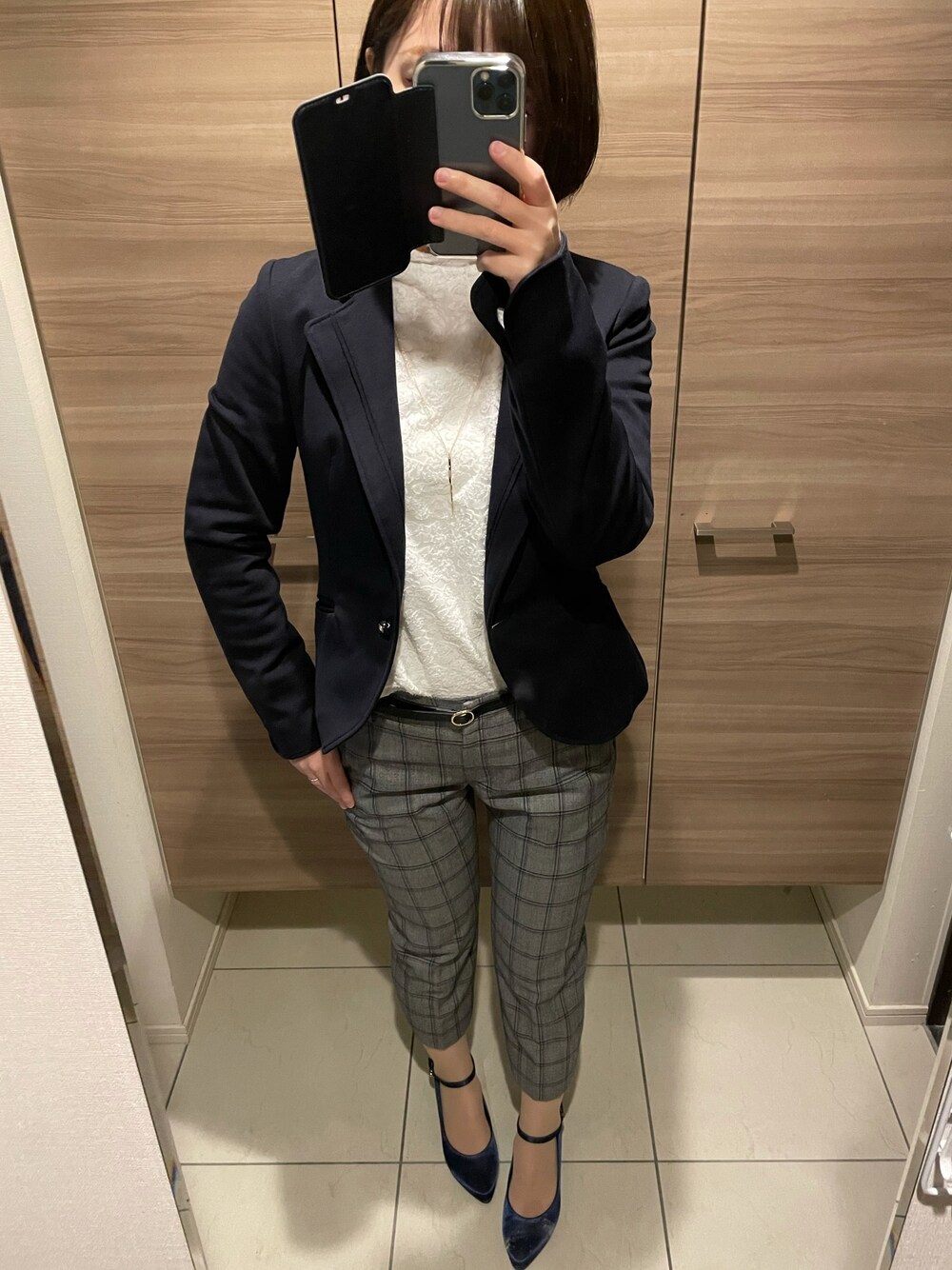 THE SUIT COMPANYのスラックス、今どき珍しいローライズ。 こちらも1ミリでも太ったら履けないシリーズ。 楽天で購入した青いサテンのパンプスもわりとお気に入り。