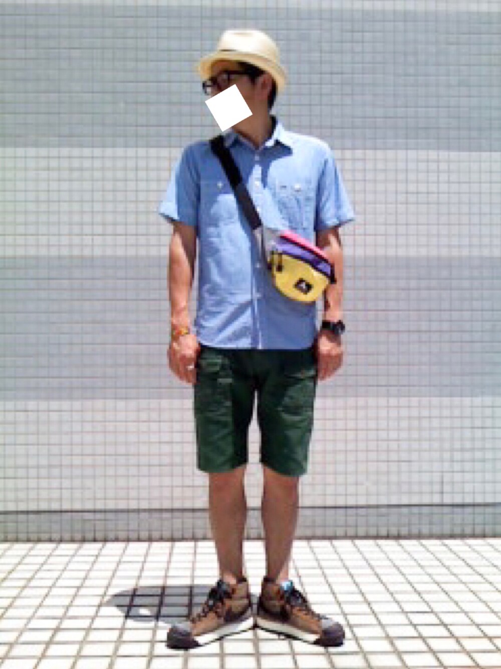 【過去のコーデからUP その15】 過去のコーデの写真になりますので、画質は、悪いです。 夏らしく、シャンブレーシャツにブッシュパンツの組み合わせ。 バッグは、夏らしくクレイジーカラーで!