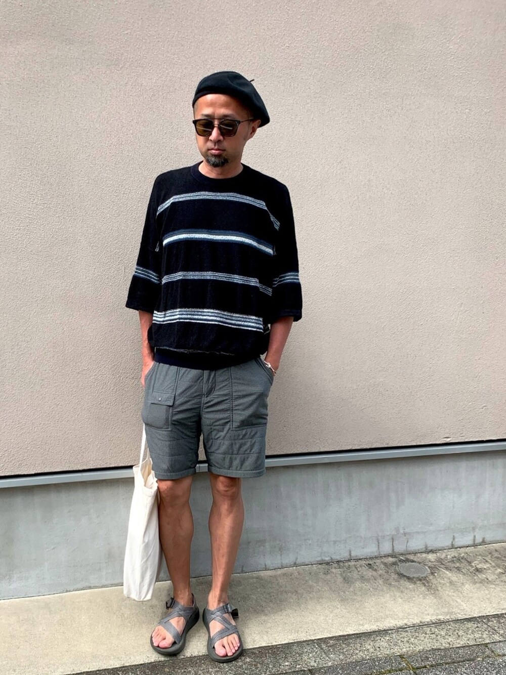 サラッとした着心地が素肌に気持ち良いサマーニット。ドロップショルダーで緩めのシルエットが今の気分。 膝上ショーツと合わせて大人なサマースタイルに。