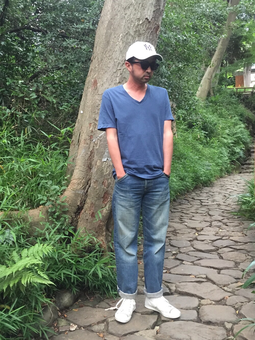 天気も良いので、有栖川公園まで。 ウォッシュ感のあるTシャツに太めのデニムが気分。