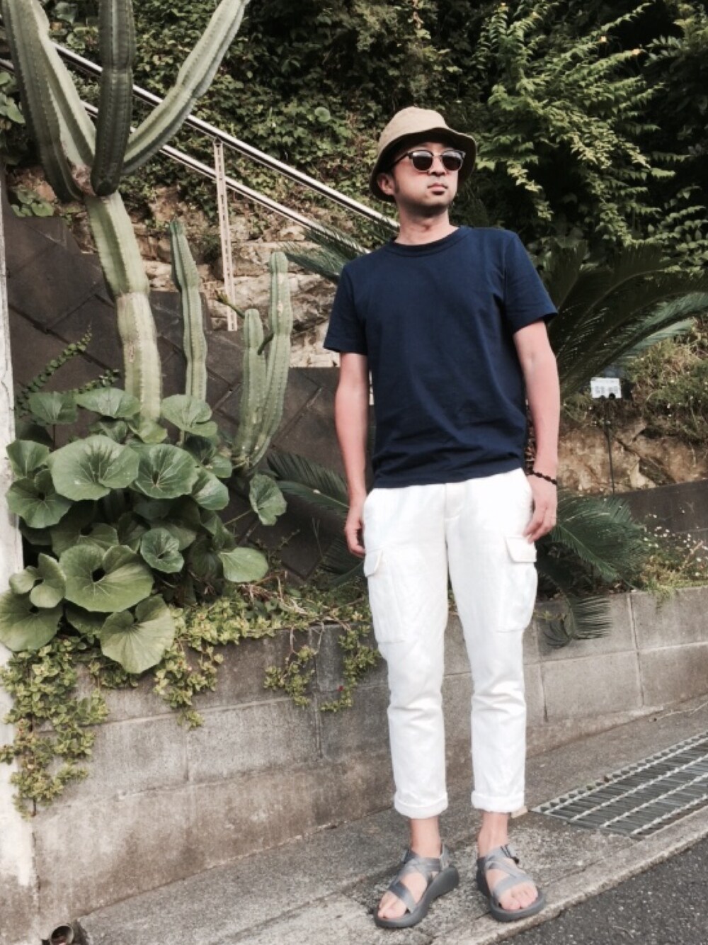 梅雨の谷間の快晴で気分も爽快な休日。 なので気張らずにシンプルなリラックス&イージーなスタイルに。 シームレスなオーガニックコットンのクルーネックTシャツは着心地最高!ホワイトパンツとお気に入りのCHACOのサンダルでクリーンに大人っぽく。