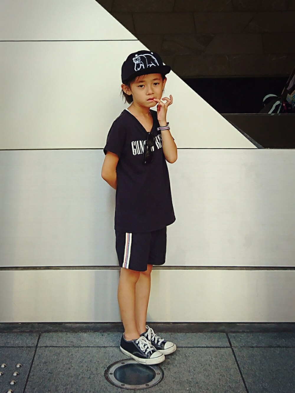 お休みなので、子供達を連れてテレ朝祭りへ。 暑いし、つまんないしでした。 あんまり楽しく無かったからか、この表情です😒 DRAGONBOYは爪を噛む癖がやめられません。家だと足の爪も噛んでるし、、、😅 コーデはオールブラックにパンツの側章と時計のトリコロールをポイントしました🎵