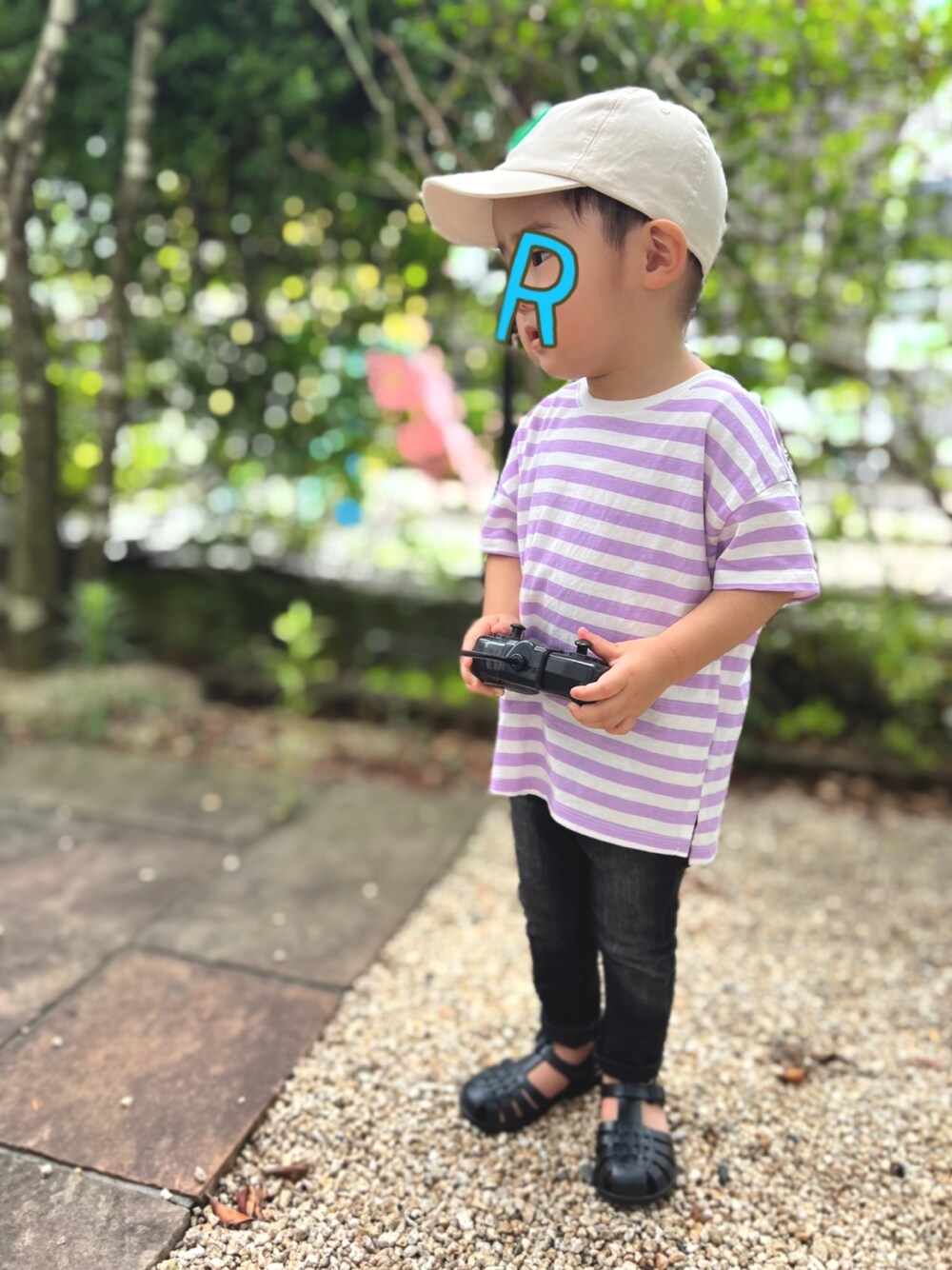 ブラック系のデニムパンツ、ブラック系のサンダル、パープル系のTシャツ/カットソーを着用したキッズの夏コーディネートの1枚目の写真