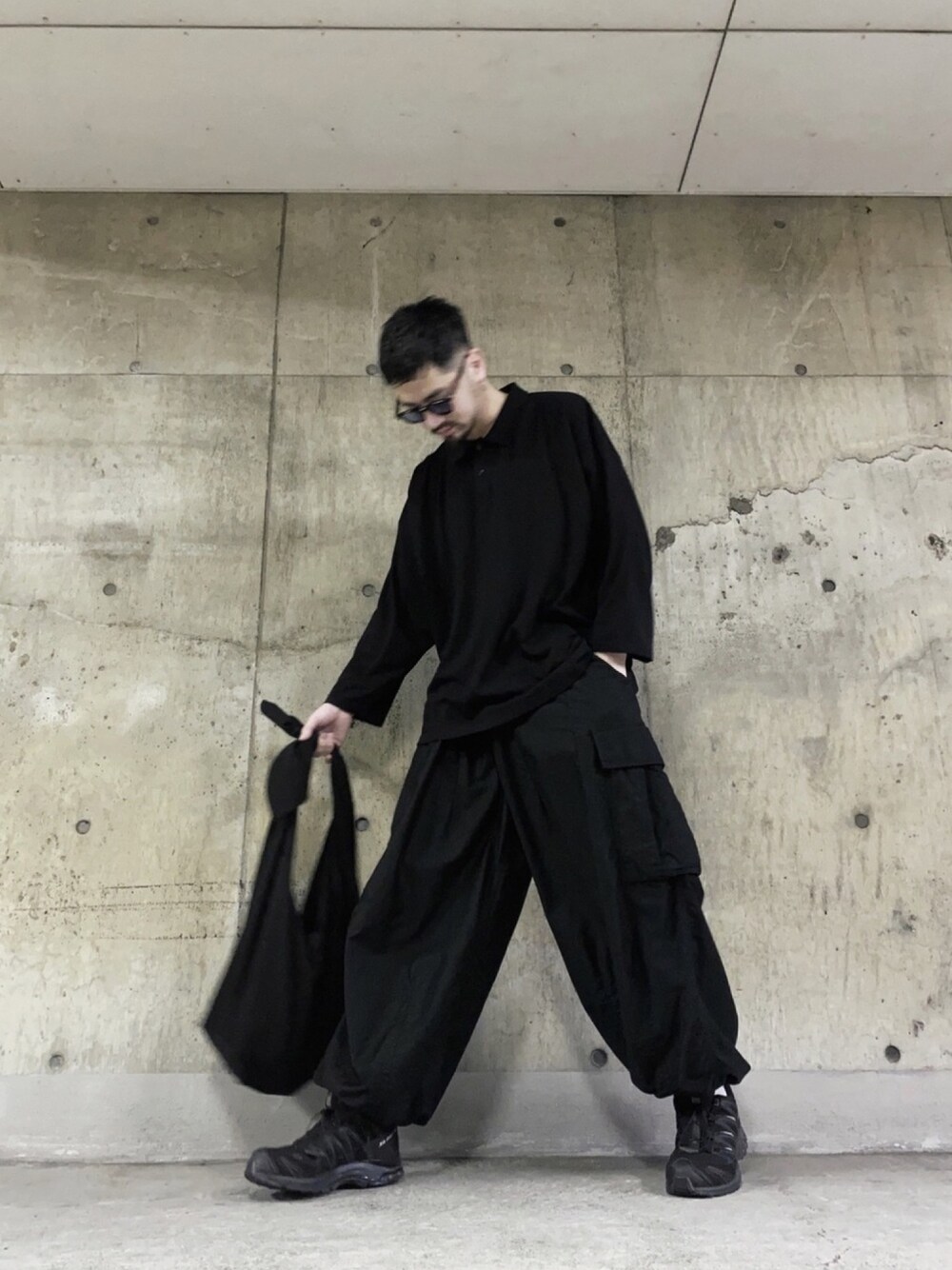 . オールブラック。 . needlesのH.D. pants(BDU)は、Lサイズでかなり太めに履いてます! . 雨の日の靴は、SALOMON一択。(安心と信頼のGORE-TEX⚠️) . polo: #nanouniverse pants: #needles shoes: #salomon bag: #dulcamara . ☑︎instagram / bow0410