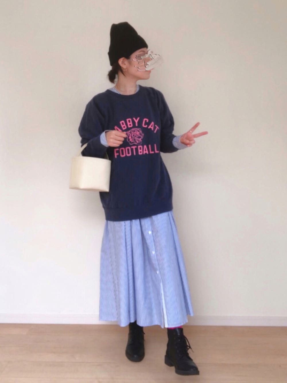 ご覧頂きありがとうございます◟̆◞̆* このスウェットのネイビー×ピンクが可愛いすぎて♪♪ 🐆もかなりお気に入り♪♪♪ 見えてないけど、歩いたり座ったりした時しか見えないロゴに合わせたピンク🧦がポイントです♡ 👜⁑ch!iii bag 👢⁑GU まとめてになりますが いつもありがとうございます𓃟ﻌﻌﻌ❤︎