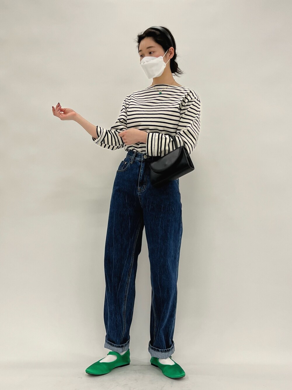 3.3field tripのボーダーTシャツとmidnight moveのデニムパンツを使った春コーデです! 定番のボーダーTシャツにはスタンダードにデニム合わせに◎ トレンドのグリーンを散りばめることでトレンド感もUP‼︎ 胸元を女性らしく見せてくれるボートネックは肩周りの横のラインを強調してくれ、面長が気になる方にオススメです! 丸顔が気になる方がお召しになる場合は髪をアップして顔まわりの縦のラインを強調すると◎ 着太りしがちなボーダーはハイウエストボトムスにタックインしてスタイルアップを狙うのがおすすめです! 程よいドロップショルダーで華奢見えも期待でき、デイリーでお使いいただけるベーシックなデザインは一枚は持っておきたい優れものです。 形が綺麗に出るデニムパンツは絶妙なワイドシルエットが今っぽさ◎ スニーカー合わせはもちろん、ヒールに合わせて大人っぽくもご着用いただける、着回し力抜群のアイテムです! 挑戦しやすいスタンダードなコーディネート、是非参考にしてみてください!