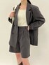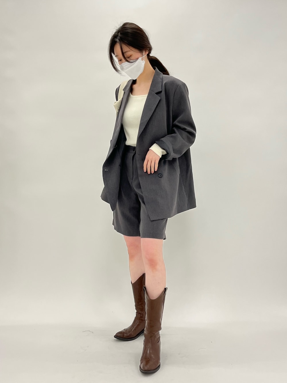 3.3field tripのセットアップコーディネートです! 今っぽいオーバーフィットのジャケットは嬉しいお尻まですっぽり隠れる長さ♪ 腰周りが気になる方でも安心して着用いただけます! 肩パッド付きで後ろ姿もすらっと綺麗な印象に。 肩線を綺麗に見せることで小顔効果も期待できます♪ 肌寒い日にはタートルネックと合わせてもスッキリ大人っぽい印象に♪ プルオーバーやニットの上からの着用でももたつかないオーバーな着用感も嬉しいポイントです! 今年もトレンドのハーフパンツは短すぎず絶妙の長さ◎ 2タック入りで腰回りをスタイリッシュに見せてくれる1着です! ウェスタンブーツでさらに韓国スタイルに♪ 上下どちらもブラックとグレーの2色展開です! 是非参考にしてみてください!