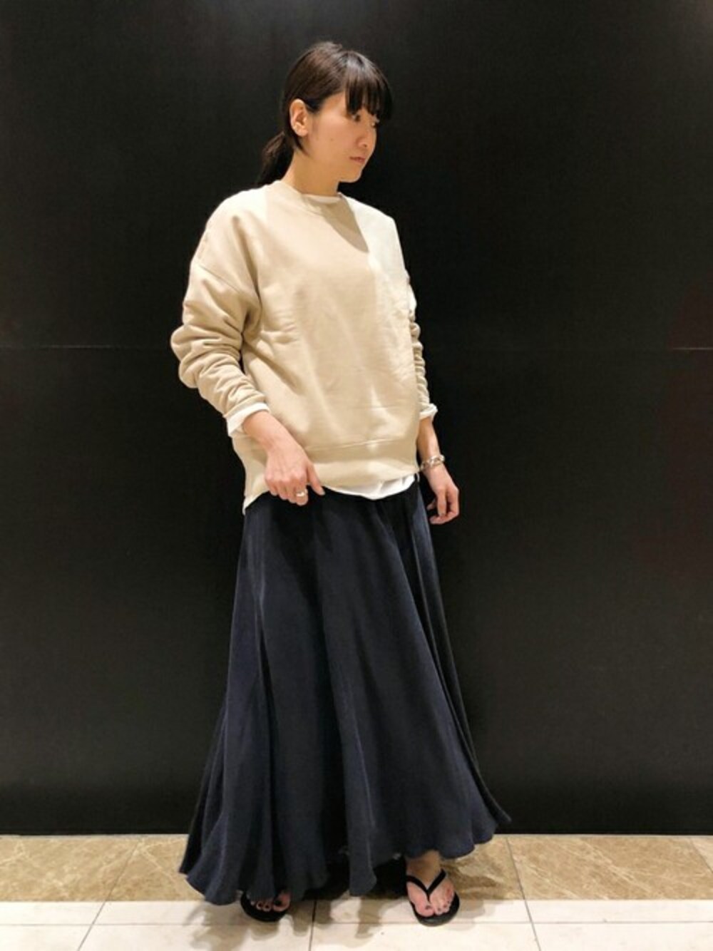 DRESSTERIORで人気のスェットに、落ち感のあるスカートを合わせた大人コーデです。 インナーを裾からチラ見せするとメリハリが出てスッキリと着ていただけます