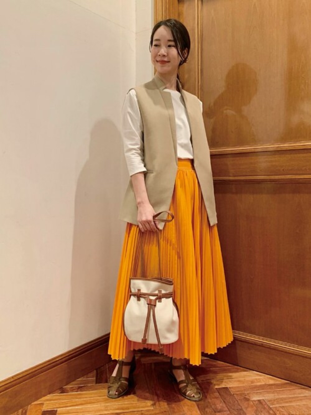 ハリのあるウェザー生地を使用したプリーツスカートは、ボリュームがありながらもウエスト周りはスッキリと見えるようにデザインされています。 ボックスシルエットのベストを合わせて、程よいラフさを取り入れたスタイリングにしました。