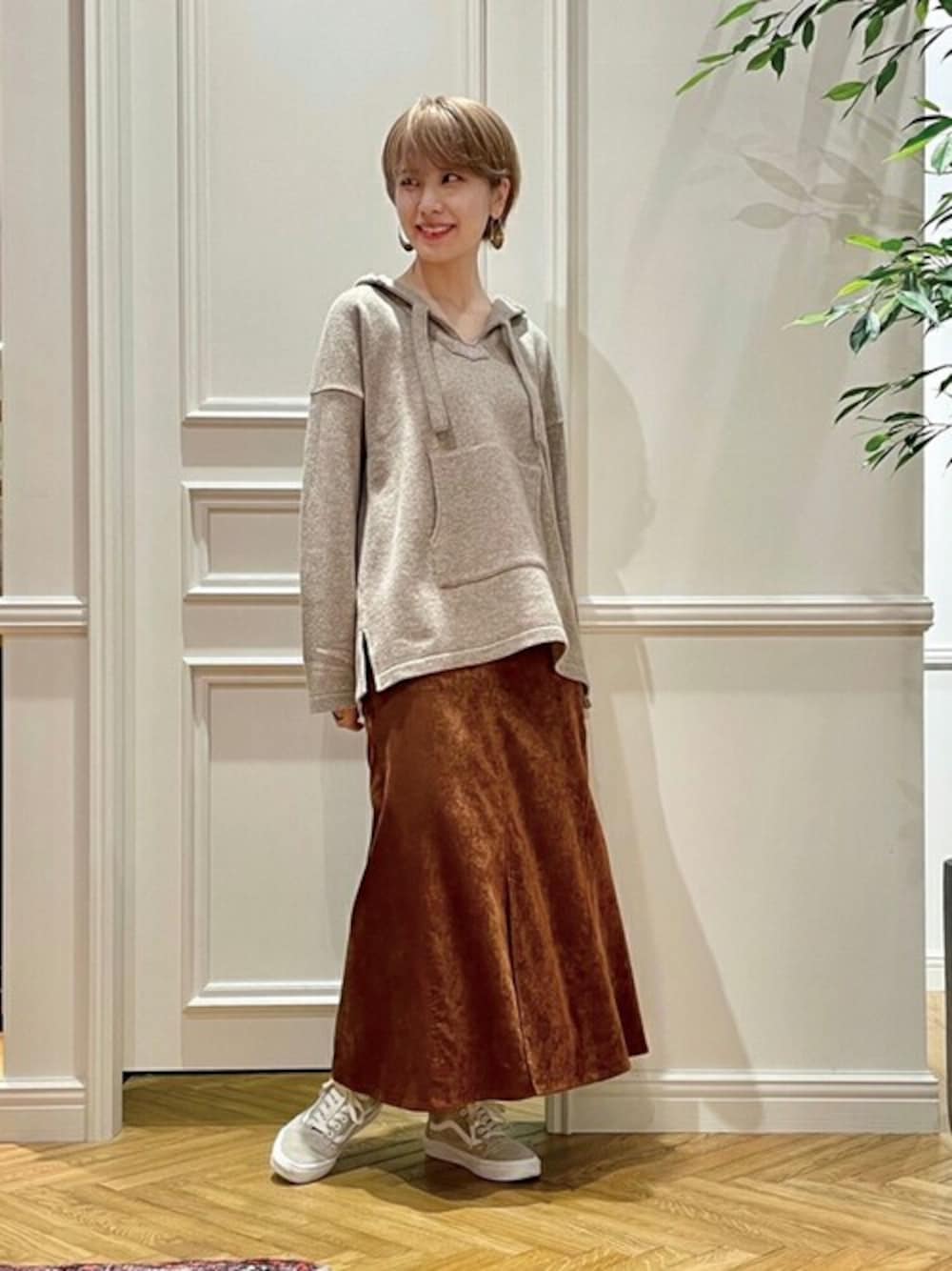 形がかわいいメキパのフードニットは程よいネックの開き具合なので一枚で様になります。スカートと一緒にブラウントーンで合わせました。