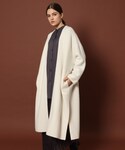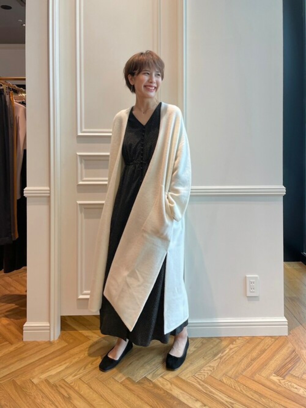肌触りが良く保温性の高いウールカシミヤのロングカーディガンは、スリット入りなのでワンピースの上に着てもシルエットを潰さずに着用できます。