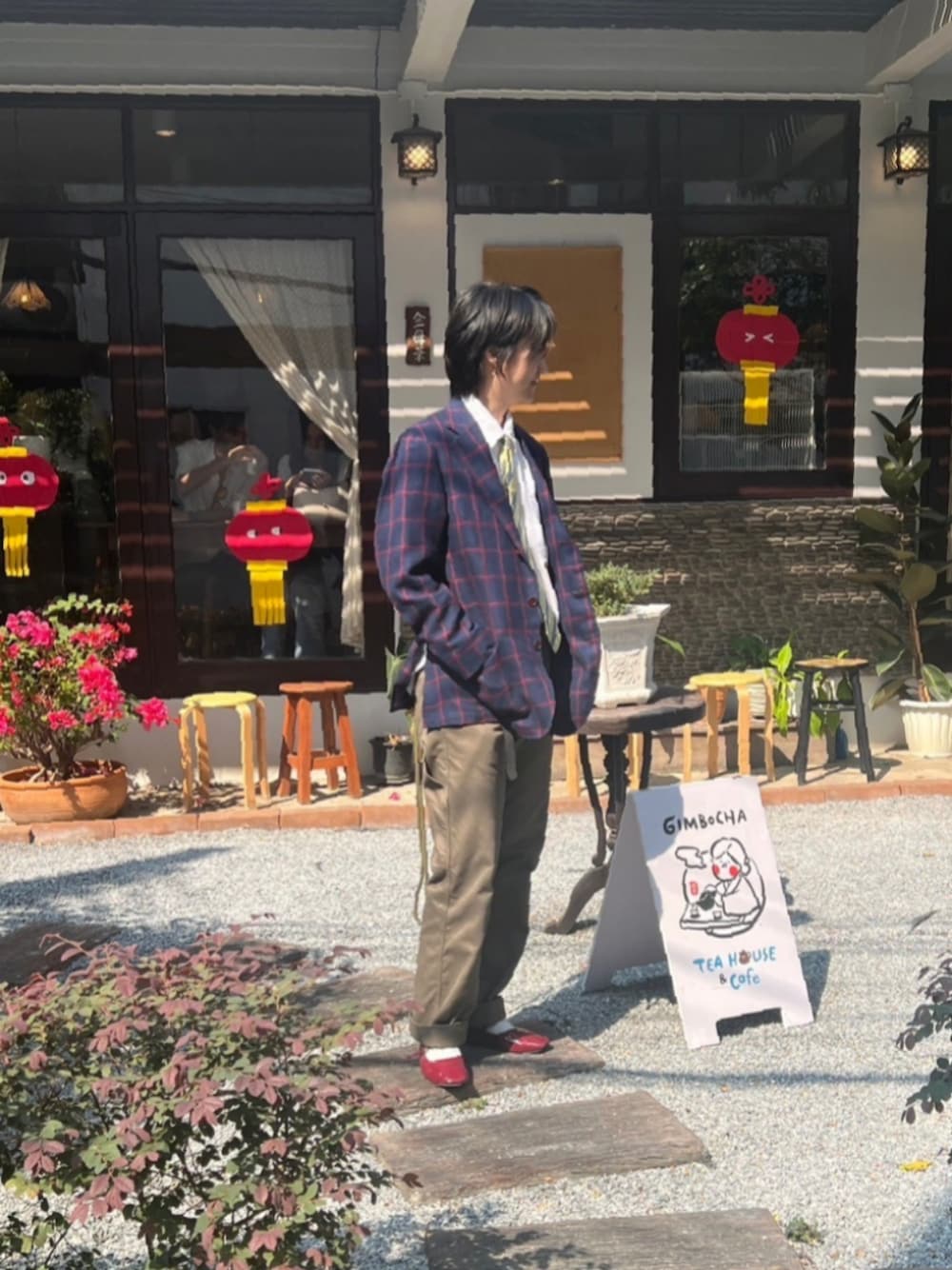 赤チェックの紺ジャケットと赤いメリージェーン。 なかなかローファーのサイズが見つからなく、今日は初めてジャケットとメリージェーンをコーデにしました。