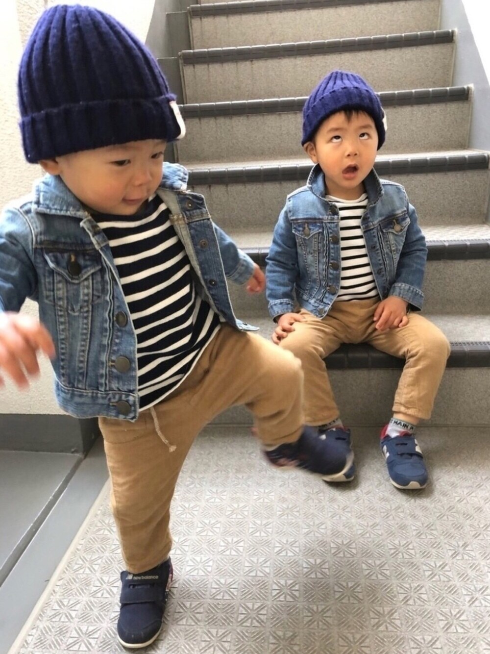 兄 ホワイト×ネイビーのボーダー 弟 ネイビー×ホワイトのボーダー 丸オソロよりも少し違うのが好みです☺️