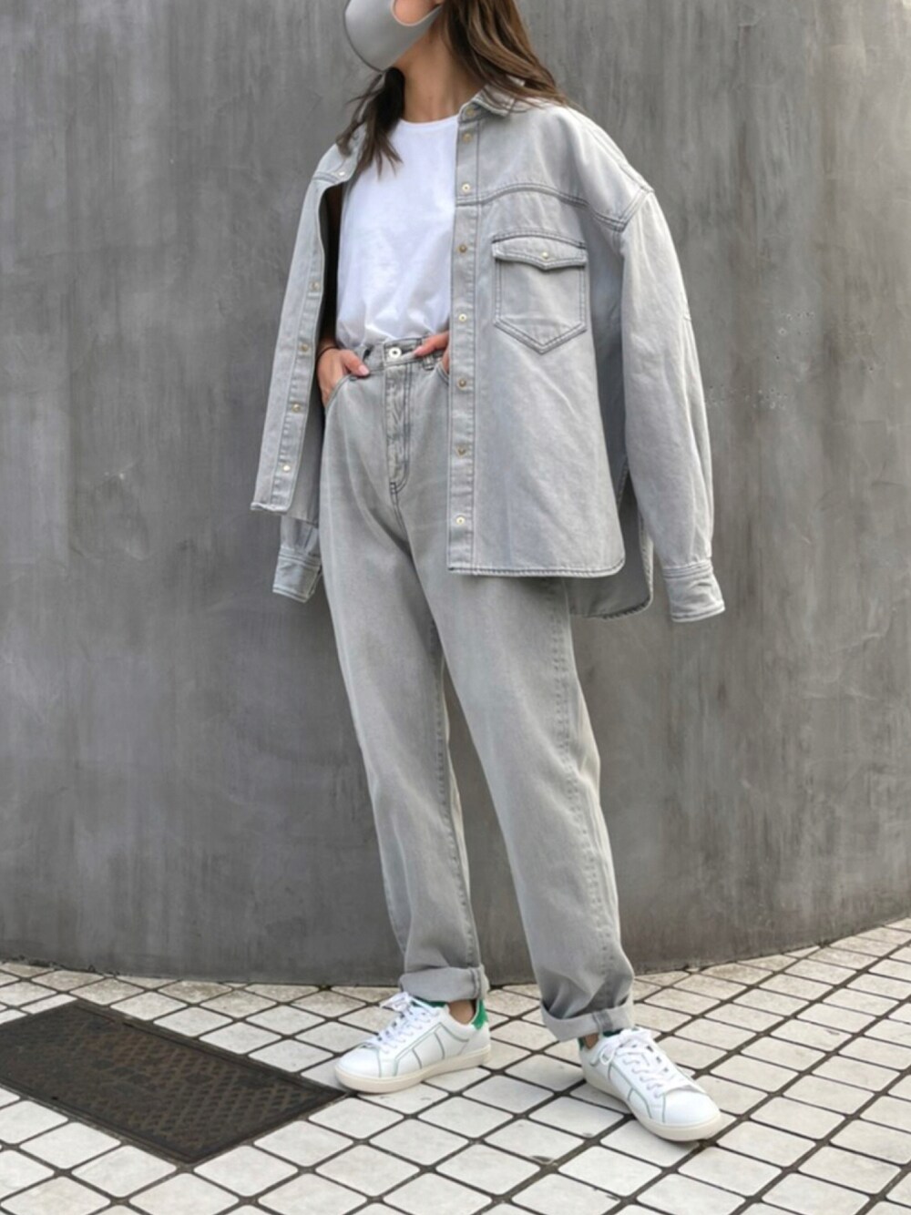 ビックシルエットのデニムジャケットに、 同色グレーのデニムパンツを合わせたセットアップスタイル。 インナーに白Tと白スニーカーを合わせて、シンプルなモノトーンコーデにまとめました✔️ ヴィンテージ感のある淡いグレーがかわいい🤍