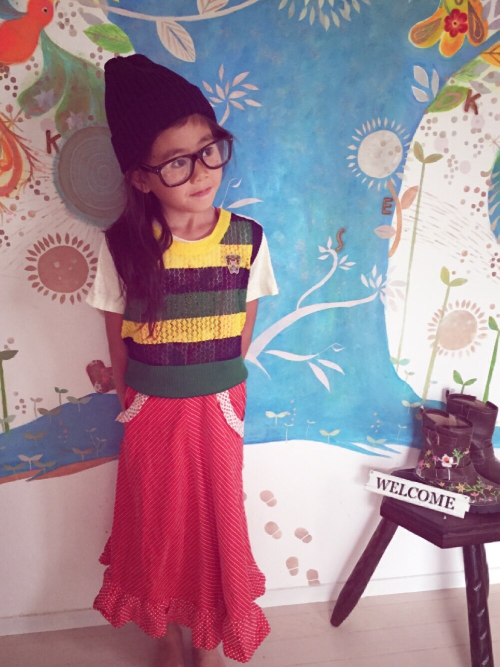 booのベスト+booインポート古着スカート ストライプに水玉がツボ メガネメガネって…(*^^*) お気に入りらしい。