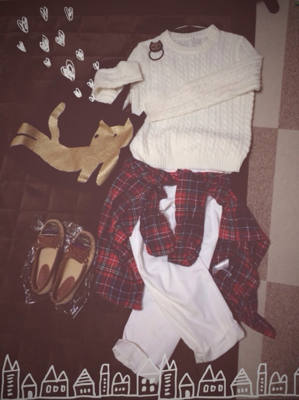 ニット、パンツ☆ GU ネルシャツ☆ UNIQLO トートバッグ☆ ツモリチサト プチプラホワイトコーデ(^^) バッグと合わせてヘアゴムもネコ♡