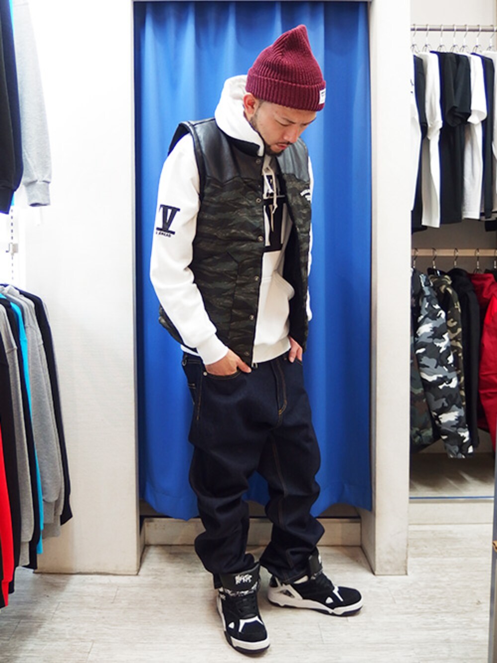 MA$SAのダウンベスト「中綿タイガーカモ迷彩ベスト」を使ったコーディネート