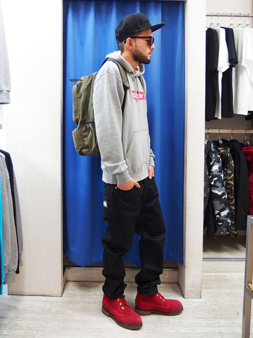 グレーパーカー×ブラックチノのシンプルなスタイル。 BOXロゴとブーツの赤、バックパックのカーキが差し色に。