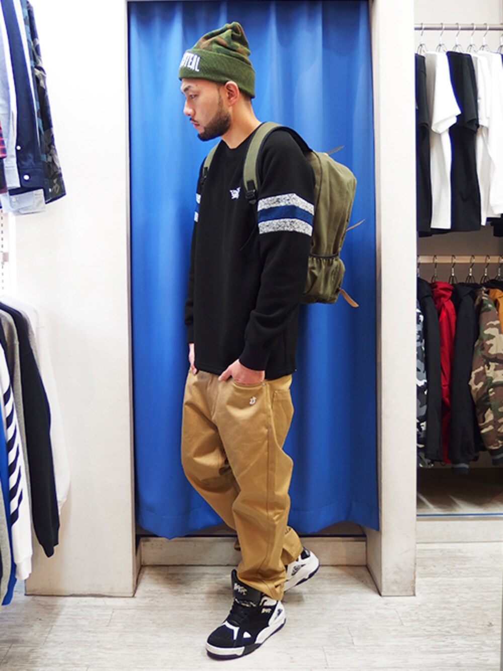 今日は軽くて暖かいニットフリースのクルーネック! ニットのような風合いなのでラフに着てもオシャ♪ ベージュのゆるチノと合わせてちょっと可愛くw 頭にはトレンドの迷彩を☆ カーキ系のアイテムと一緒に取り入れると上手くハマりますよ! (今回だとバックパック) スニーカーはトップスとの合わせでチョイス! 質問やコメントなどお気軽にどうぞ~♪ 公式オンラインショップもぜひ!