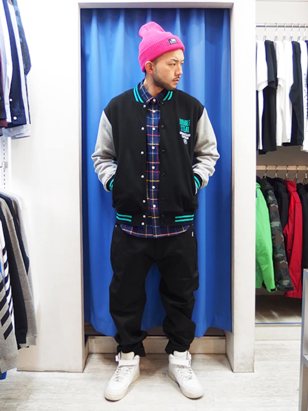 「べ、別にかわいいなんて言ってほしくないんだから!」 ペンネーム、もーすぐ30歳のヒゲ坊主さんからの投稿ですw ベースが黒なのでコーデが締まって見えますし 鮮やかな差し色もより際立ってイイ感じ~♪ 度詰め裏毛+ワッフルの スウェットスタジャン(ブラック×ミントL)に 綿フランネルシャツ(ネイビー×カラフルL)に チノクロスパンツ(ブラック×カラフル刺繍L)に 肉厚リブ編みニット帽(ピンク)に NIKE AF1です☆ コメントなどお気軽にどうぞ♪ バックショットは 本日夕方更新予定の公式ブログで! 公式オンラインショップも要チェーック!!