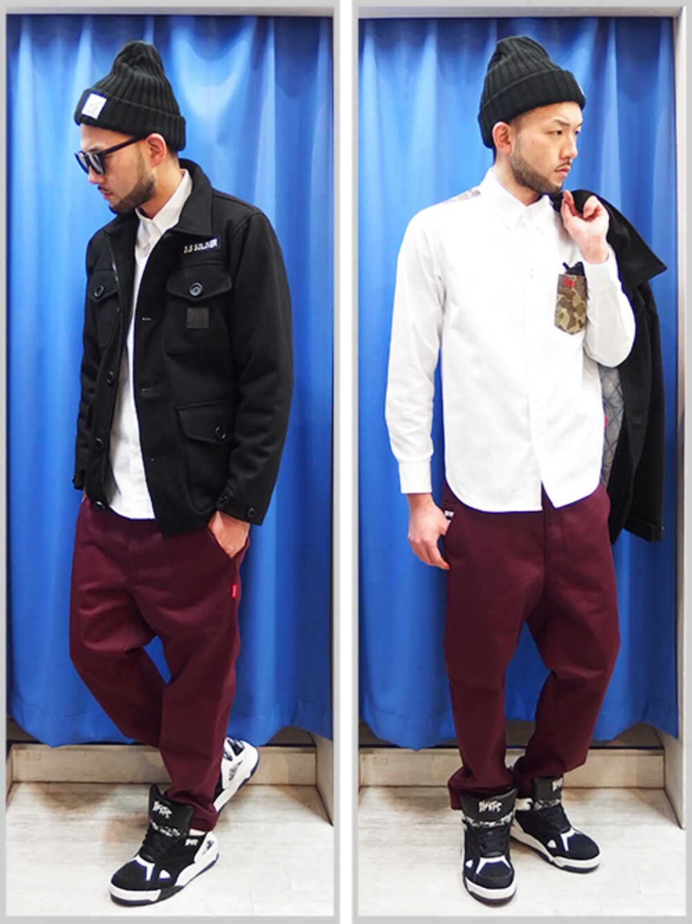いや~更新空いちゃってすいません! みなさん寂しくて そろそろ禁断症状が出だしたころでしょうw そんな禁断症状でアヘアヘになってるみなさんに こんなこと言うのもなんですが… これが今年最後の更新になりますww 寂しいですか? …。 うんうん、言わなくてもわかりますw 大丈夫、僕はいつもみなさんの心の中にいますから! とゆーことで心の不法侵入者が送る 今年の締めコーデは 来たる2015年が幸多きものになるよう紅白コーデで! オトナ紅白です☆ シャツには今年のオシャレを象徴する迷彩が♪ ライトメルトン+中綿キルティングの フィールドジャケット(ブラックM)に 長袖オックスシャツ(ホワイト×カモM)に T/Cツイル9分丈ナローパンツ(ダークレッドM)に 肉厚リブ編みニット帽(ブラック)に サングラス(ブラック×ブラックレンズ)に Reebokです☆ 商品リンクのないアイテムは 公式オンラインショップで! そんなわけで名古屋店は今日が年内最後の営業。 今年の10月にWEARを始めましたけど いいねやコメントで絡んでくださったり 中にはWEARきっかけでお店に遊びに来てくださったりと 新たな仲間ができて嬉しい限りです♪ 本当にありがとうございました! そして来年もよろしくお願いいたします!! 2015年は一発目から セールや店頭限定の福袋が待ってます☆ 公式オンラインショップに詳細をUPしてますので 要チェックですよ! ではではみなさま、良いお年を~♪