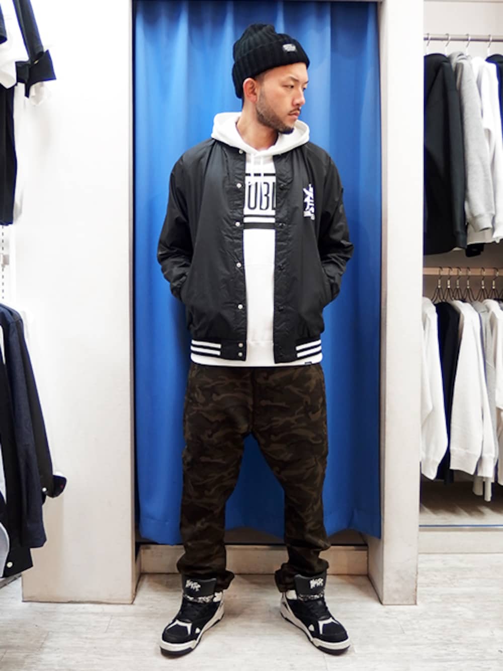 名古屋も一気に寒くなってきたので 今日は裏毛パーカー+ナイロンスタジャンの王道ストリートで☆ パンツをユルめの迷彩テーパードにして今どきなオシャレ感に♪ WEARとは違うスナップをUPしてる 公式ブログや公式インスタも要チェックですよー!