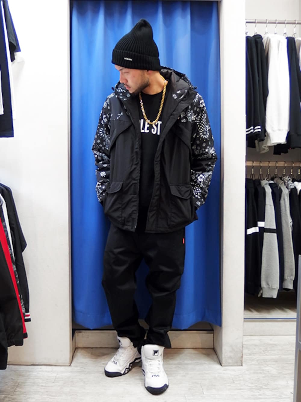今日はオリジナルのバンダナ柄がイカすマウンパでモノトーンストリート☆ 緩めのサイジング&ブラックコーデ&金ネックで雰囲気満点です♪ 直営店では今日からモアセールがスタートし 店頭・オンラインショップともに盛り上がっておりますよー! みなさんぜひ遊びに来てくださいね♪ WEARとは違うスナップをUPしてる 公式ブログや公式インスタも要チェックで!