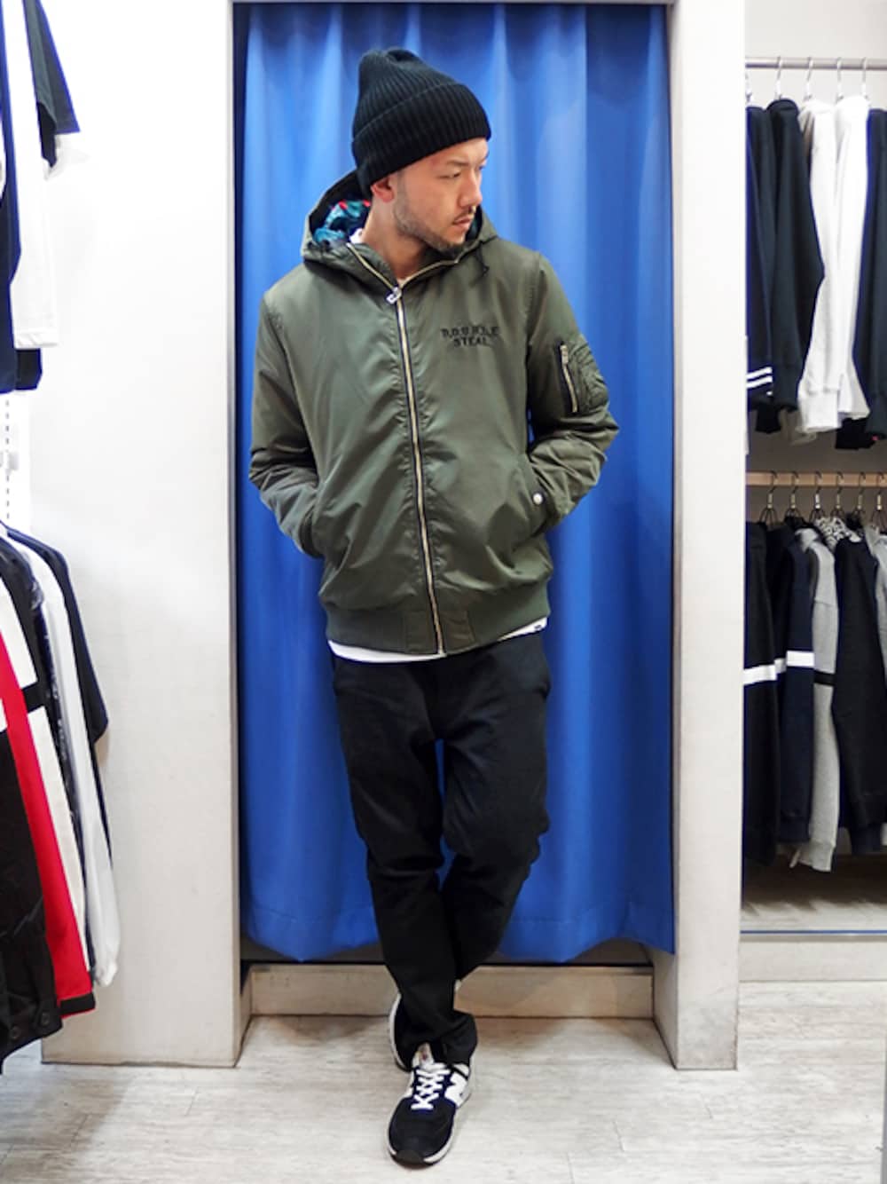寒いので裏起毛トレーナーの上から 中綿入りのフード付MA-1を羽織って締めて着た スタイリッシュなミリタリーストリート☆ フードのおかげで締めて着てもイカしてます! 裏地の花柄もフードからチラ見えでイイ感じですよ♪ WEARとは違うスナップをUPしてる 公式ブログや公式インスタも要チェックですよー!
