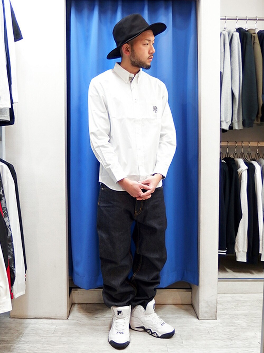 今回は爽やかな白シャツにルーズ感が魅力の新作レギュラーデニムで とんねるずのノリさん的なストリートスタイルに☆ 太めのパンツにハットを合わせるのも中々イイ感じですな♪ ちなみにこのシャツはセール中ですよ! WEARとは違うスナップをUPしてる 公式ブログや公式インスタも要チェックですよー!