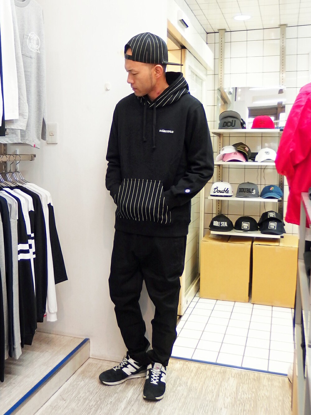 良い天気ですね~♪ みなさん紅葉狩りに行ってるでしょーか? ヒマな方はぜひお店に冬物狩りに来てくださいね! さて今日は、 部分的なストライプがオシャレなブラックの裏起毛パーカーを着て 控えめなデザインで使い勝手の良いブラックのテーパードチノを合わせた オシャレブラックストリートスタイル☆ このパーカーもキャップも入荷したての最新作です♪ 店頭で先行販売中ですのでお店に来て先取りするっきゃないですよ!! ブログやインスタもお見逃しなくー!