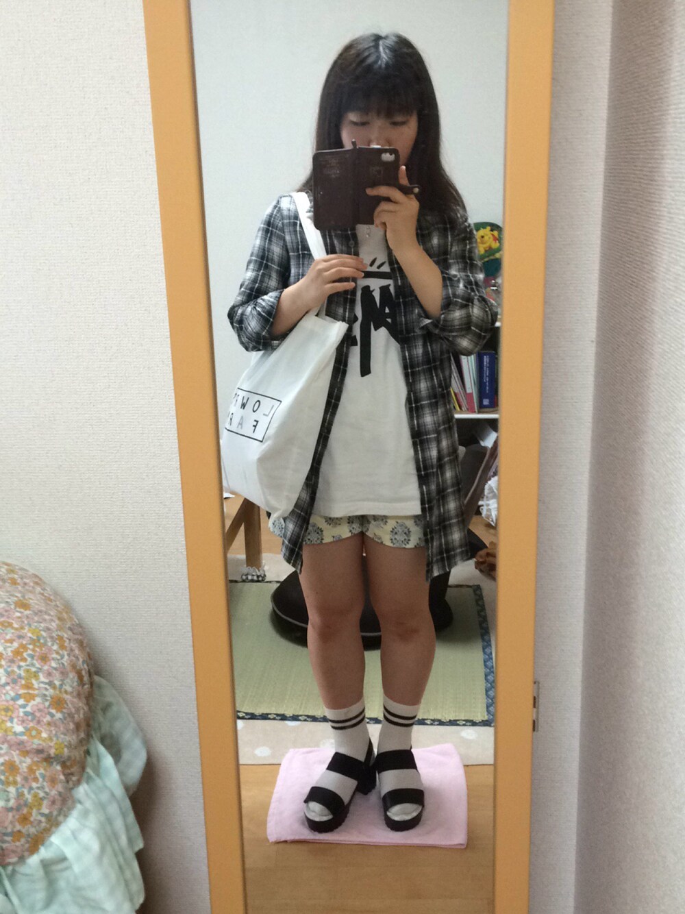 雨で気温が低めなので、Tシャツの上にロングシャツを着ました! Tシャツのシルエットが大きめでショートパンツのダマスク柄をちら見せしたので、シャツのチェック柄とケンカしません◡̈*✧